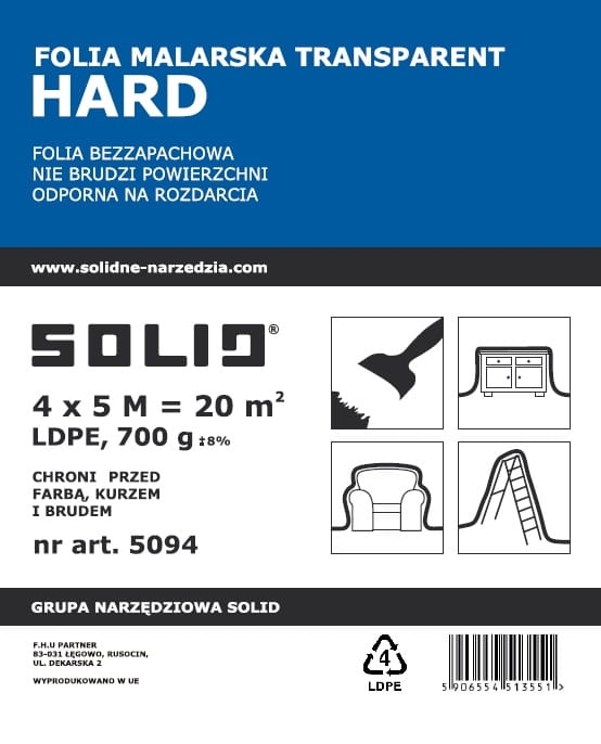 Folia malarska 4x5m 20m2, LDPE, 700g 5094. Chroni przed farbą, kurzem i brudem.