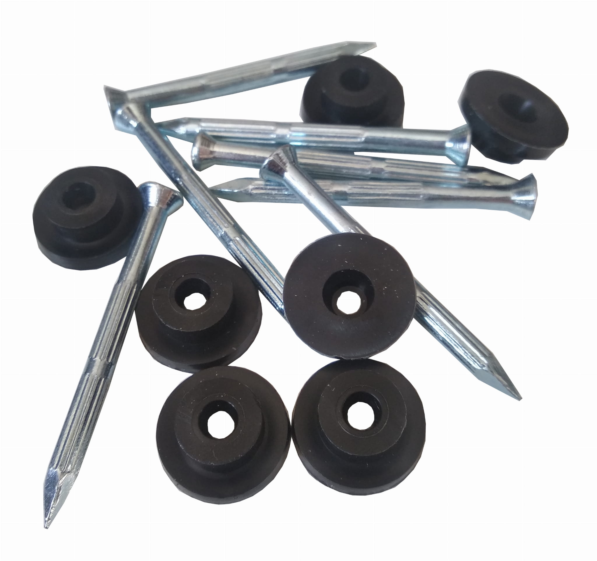 Specjalistyczne gwoździe ze stali hartowanej wykorzystywane do montażu folii fundamentowej. W komplecie posiadają specjalną podkładkę z tworzywa sztucznego która uszczelnia miejsce w którym montowany jest gwóźdź. Gwoździe w komplecie z podkładką tworzą idealny system montażowy dla folii fundamentowej.