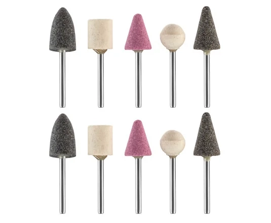 Profesjonalny zestaw nasadek przeznaczonych do precyzyjnego wykańczania, szlifowania i polerowania powierzchni. Różnorodność kształtów w zestawie pozwala na wykonywanie zadań o dowolnym stopniu złożoności – od szlifowania płaskich powierzchni po obróbkę trudno dostępnych otworów wewnętrznych i wgłębień.