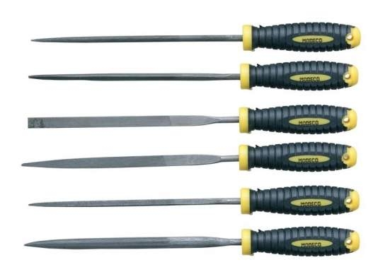 Komplet sześciu pilników precyzyjnych firmy Modeco. Pilniki mają długość 70 mm i uchwyt Friendly Grip. Doskonałe do obróbki stali, aluminium, oraz Cu, Ms, Zn, Ni.